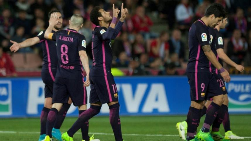 Barcelona made light of the suspended Lionel Messi's absence to remain just two points behind La Liga leaders Real Madrid as Neymar netted his 100th goal for the club in a 4-1 win at Granada.