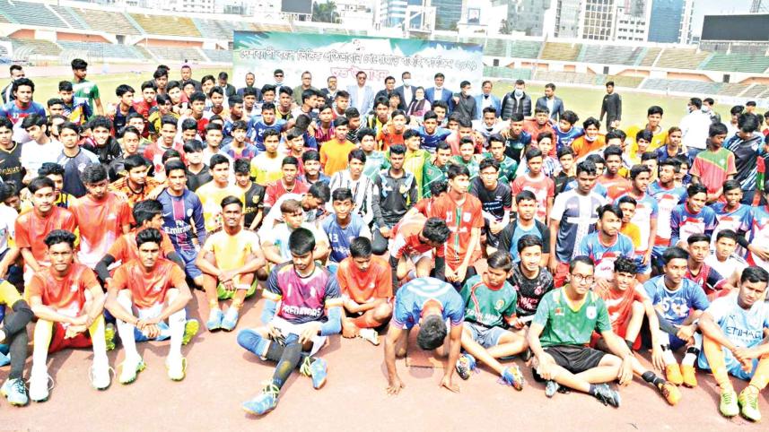 Bangladesh Football Federation officials pose for a photograph with budding footballers who turned up at the Bangabandhu National Stadium
