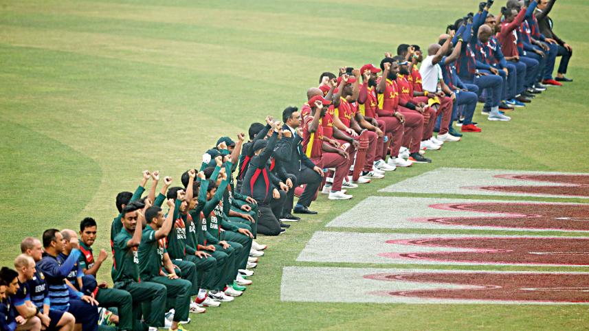 The players and coaching staff of both teams along with the match officials take a knee in solidarity with the Black Lives Matter movement prior to the game yesterday. PHOTO: STAR