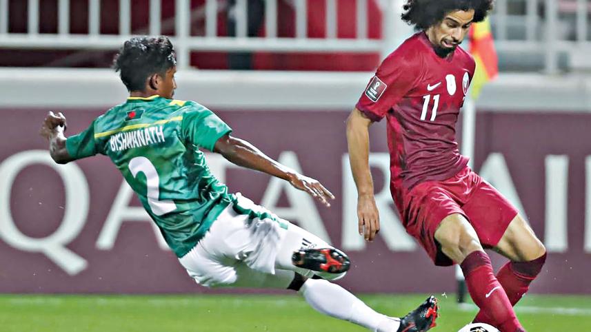 Qatar coach Felix Sanchez brought four changes in the squad that beat Bangladesh 2-0 in Dhaka last year. The hosts put pressure from both wings, with forward Akram Hassan Afif causing most trouble down the left. The Bangladesh defence looked vulnerable initially as they were startled by the quick exchanges between the Qatari forwards. But it was either Zico or the Qatari forwards' failure in hitting the target that helped Bangladesh.