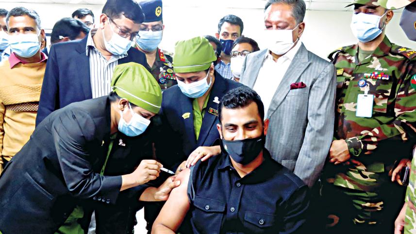 Bangladesh ODI skipper Tamim Iqbal and all-rounder Mehedi Hasan Miraz being administered the Covid-19 vaccine yesterday. A number of Bangladesh cricketers, who are expected to be named in the preliminary squad for the upcoming New Zealand tour, got the coronavirus vaccine at the Kurmitola General Hospital under the supervision of the Bangladesh Cricket Board (BCB). "The thing about vaccination is that if you know how helpful it is for you then I think your fear will be reduced. I will not deny that I was afraid. When the first approach was made, I was not sure whether to take it or not. But after talking to the BCB and when many people suggested that it is normal to have symptoms, it seemed to me that I could take it," said Tamim after getting vaccinated.
