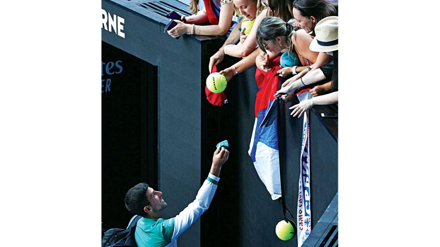 Novak Djokovic gives away his wristbands after winning his second round match of the Australian Open against Frances Tiafoe yesterday. Djokovic’s aura of invincibility at Rod Laver Arena wavered under the pressure of Tiafoe but the Serbian rose to the challenge to claim a tough 6-3, 6-7(3), 7-6(2), 6-3 win. The double-defending champion has rarely been tested so early at his favourite Grand Slam but he had his hands full against American Tiafoe, whose sparkling tennis revived memories of his exhilarating run to the 2019 quarter-finals. “Very tough match,” said a relieved Djokovic on court, his voice faint and hoarse from the battle. “Also difficult conditions. While we had sun on the court it was very, very warm. I want to give a hand to Frances again for a great fight. It was a fantastic match. If I have to choose obviously I would like to have these kinds of matches in the opening week.” PHOTO: REUTERS