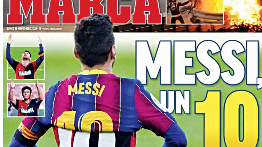 The footballing world, still reeling from the loss of Diego Maradona, continued paying homage to the Argentine legend. The cover picture of Spanish sports daily Marca yesterday portrayed Lionel Messi’s tribute to his icon. Messi, like Maradona, has played for both Barcelona and Newell’s Old Boys. The current Barcelona skipper removed his shirt to reveal the red and black of the Rosario club before pointing to the sky, dedicating his goal against Osasuna in a La Liga encounter on Sunday. PHOTO: TWITTER