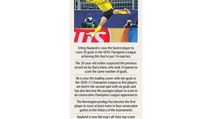 Haaland became the fastest player to reach 20 goals in the Champions League, as well as the youngest, after scoring twice against Sevilla in the last 16.