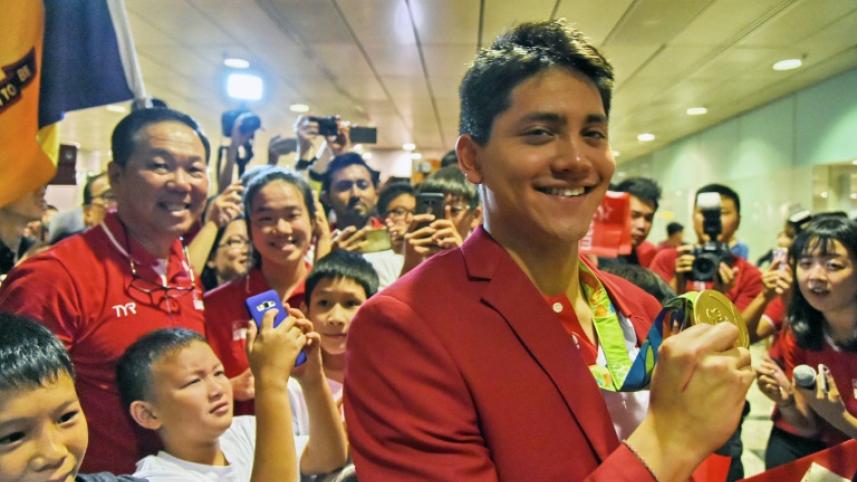 Singapore swimmer Joseph Schooling returned home to a rousing welcome on Monday after winning the city-state's first ever Olympic gold medal with a stunning victory over the legendary Michael Phelps.
