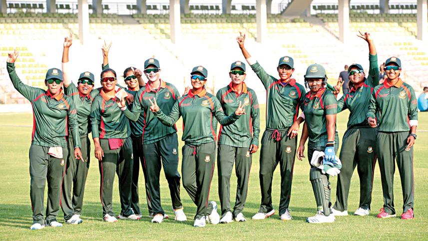 Bangladesh Women’s Emerging team players celebrate after a comfortable 54-run victory over visiting South Africa Women’s emerging team in the