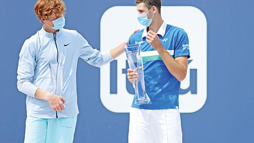 Jannik Sinner congratulates Hubert Hurkacz, who was vaulted into the top 20 for the first time in his career on Sunday after clinching his maiden Masters 1000 title at the Miami Open, a win he said provided added “motivation” to succeed. Poland’s Hurkacz downed Sinner 7-6(4), 6-4 in the men’s final as a handful of double-faults in the match proved costly for his 19-year-old Italian opponent. “I had a big belief in myself ... Winning the tournament like this like gives you extra, I think, like motivation and self-confidence,” said 24-year old Hurkacz, now 16th in the world. The 19-year-old Sinner would have been the Miami event’s youngest winner had he defeated Hurkacz. “When you’re 19 and playing finals, obviously it’s tough, and I wanted to win. It has been a good week anyway. But obviously I’m not here for making finals, I’m here to win tournaments. It’s going to be back to work and then we will see what I can do on the clay,” said Sinner. PHOTO: REUTERS