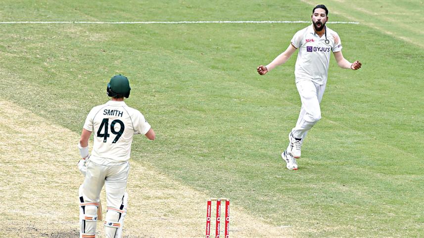 Pacer Mohammed Siraj celebrates the wicket of Steve Smith during Day 4 of the fourth Test yesterday. Siraj best illustrated India’s never-say-die attitude with his maiden five-wicket haul (5-73) in the Brisbane decider. It has been an emotionally testing tour for the 26-year-old who lost his father in November but stayed on to make his Test debut in Melbourne. “I’m grateful I got this opportunity to play for India and managed a five-for. I wish my father was around to see it. It was tough after he passed away. I spoke to my family and gained strength after talking to my mother. My focus was to fulfil my father’s dream of me playing a Test match for India,” an emotional Siraj told a video conference. PHOTO:BCCI
