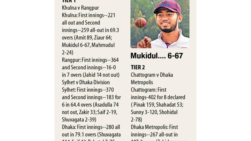 It was the Mukidul show after that, as the seamer bowled first innings centurion Tushar Imran and skipper Nurul Hasan off consecutive deliveries. He picked his third five-wicket haul in first class cricket by removing two well-set batsmen, Ziaur Rahman (64) and Amit (89), rattling through the Khulna batting order.