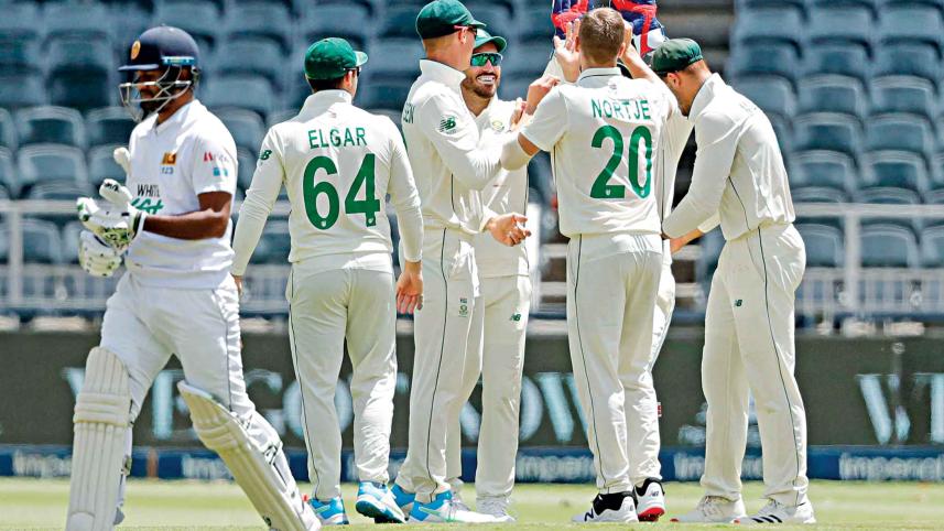 South Africa's Anrich Nortje (2nd from R) celebrates with teammates after the dismissal of Sri Lanka captain Dimuth Karunaratne during the first day of the second Test at the Wanderers Stadium in Johannesburg yesterday. Nortje's six-wicket haul saw Sri Lanka bowled out for only 157 after the visitors chose to bat. South Africa ended the day with 148 for 1.
