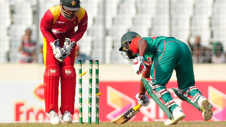 The TV umpire Enamul Haque saw about seven replays to ascertain whether Chakabva did knock down the bails and then adjudged Mahmudullah, who was standing near the dressing-room, not out. He was unbeaten on 32.
