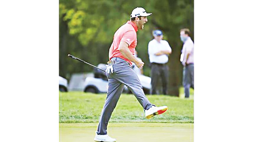Rocketing up the leaderboard on Sunday, Rahm then drained the long putt in the first hole of a playoff against Johnson, letting out an elated roar.