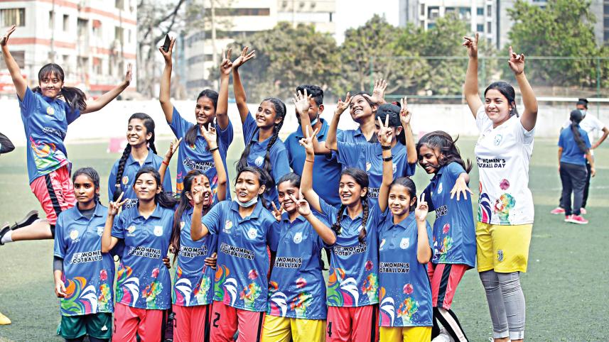 International Women’s Day was celebrated by women sportspersons of different disciplines. Some 200 budding female footballers from BFF age-group teams and a number of schools took part in six-a-side matches at the BFF astro-turf. The footballers received certificates from BFF as part of AFC Women’s Football Day. PHOTO: FIROZ AHMED/BCB