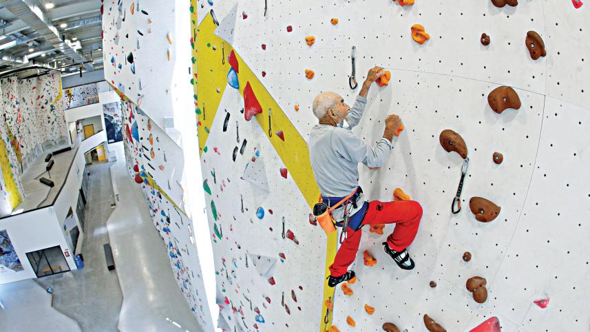 The veteran slowly puts on his climbing shoes and harness and having picked out his ascent route, makes his way to the 16-metre (52-foot) high wall.
