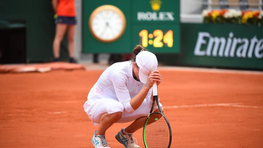 Iga Swiatek falls to her knees after clinching the French Open title. Photo: Roland Garros Twitter