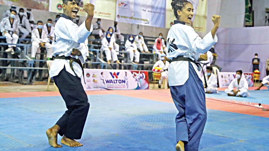 Following a five-month halt to the country’s sports due to the coronavirus pandemic, Taekwondo became the first discipline to make an official comeback with its poomse competition, a kind of physical demonstration, at the National Sports Council auditorium yesterday. Some 200 participants from 20 clubs and districts are competing for 36 gold medals. The youth and sports ministry last month allowed sports federations to start their activities on a limited scale while maintaining health guidelines. Other disciplines like cricket, hockey, archery and football have gradually resumed activities through training programmes. Photo: FIROZ AHMED