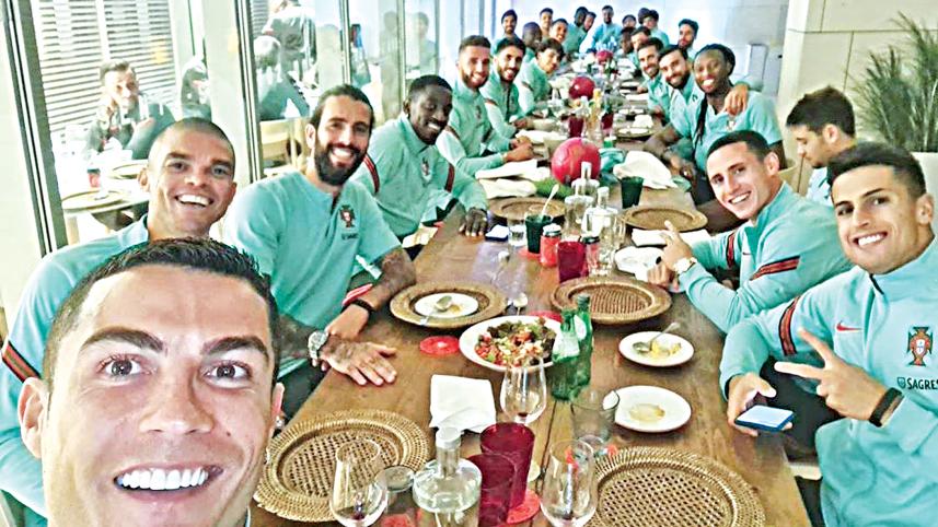 Cristiano Ronaldo posted this photo of a team meal with all members of the Portugal squad and wrote: “Unidos dentro e fora do campo! (United on and off the