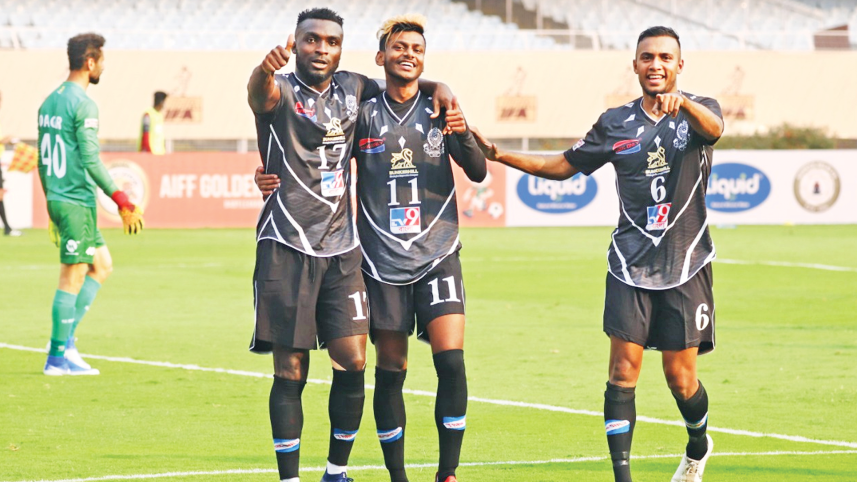 Bangladesh captain Jamal Bhuiyan (R) celebrates with Faisal Ali (C) and Raphael Odoyin following Faisal’s 58th-minute goal for Kolkata