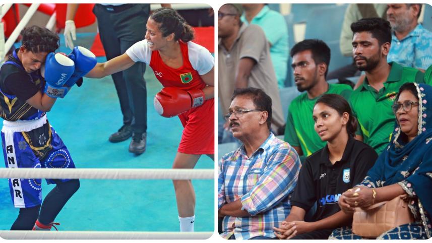 Bangladesh women's football team captain Afeida Khandaker, used to being under the spotlight, watched on from the stands with her parents, as her elder sibling Afra Khandaker fought in the 52kg weight category final of the Women's Boxing Championship against New York-based boxer Zinnat Ferdous at the Mohammad Ali Boxing Stadium in Dhaka on Thursday.