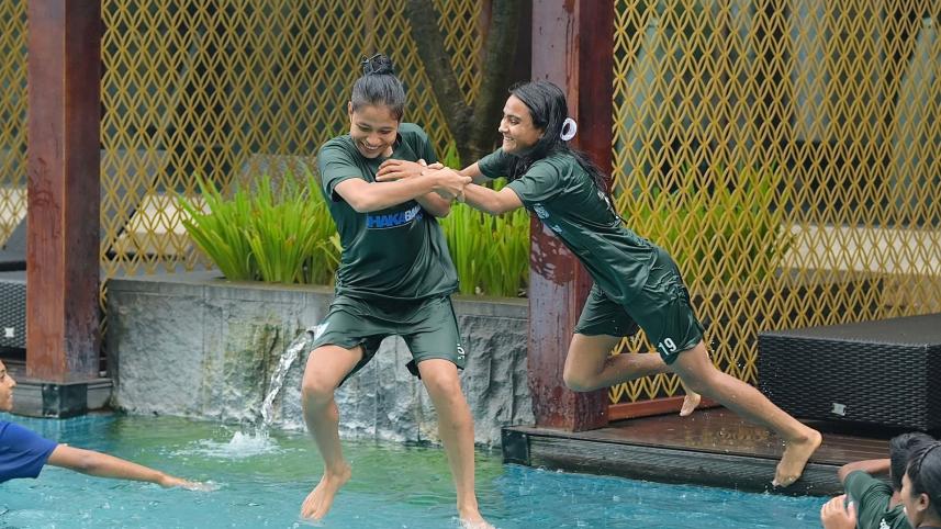 Bangladesh forward Mst Sagorika and midfielder Munki Akhter share a light-hearted moment during a swimming and light gym session yesterday. Fresh from a 3-2 win over Nepal in their second match, the Bangladesh women's team take on Bhutan today at 3pm at the Bashundhara Kings Arena in their third SAFF U-20 Championship clash. The hosts had earlier launched their campaign in style with a 9-0 win against Sri Lanka. PHOTO: BFF