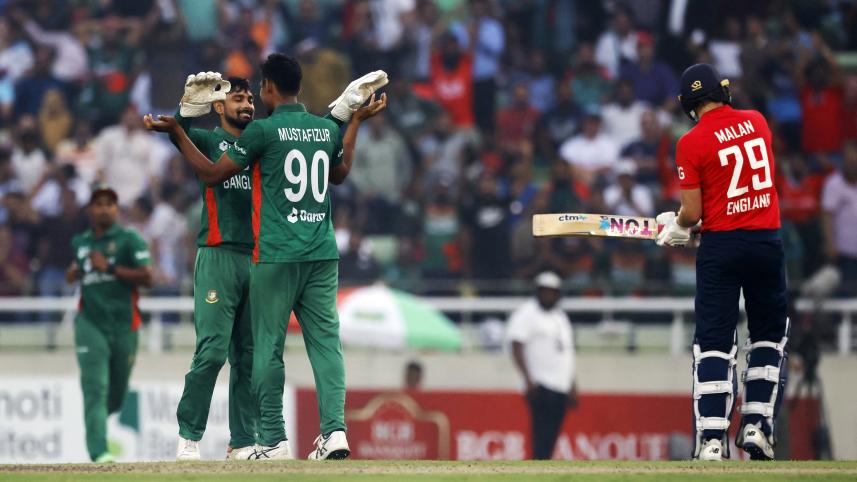 With the game tilted heavily towards the visitors, Shakib introduced Mustafizur in the 14th over and the left-arm pacer, who has recently received sticks for losing his charm, did the trick for the Tigers immediately by dismissing a set Dawid Malan for 53. A short delivery from Mustafizur got extra bounce and a slight outswing off the pitch to see Malan's attempted pull only get an edge back to the wicketkeeper Liton Das, who took a sharp catch behind the stumps.