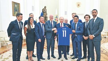 FIFA president Gianni Infantino told President Vladimir Putin on Friday the world was "in love" with World Cup hosts Russia and praised him for overcoming negative stereotypes about the country.