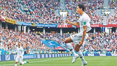 France became the first team to reach the World Cup semifinals as goals from Raphael Varane and Antoine Griezmann gave them a deserved 2-0 victory over Uruguay yesterday.