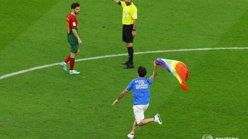 A man carrying a rainbow flag and wearing a T-shirt with the words "Respect for Iranian Woman" on the back invaded the pitch during a match at the Qatar World Cup on Monday.