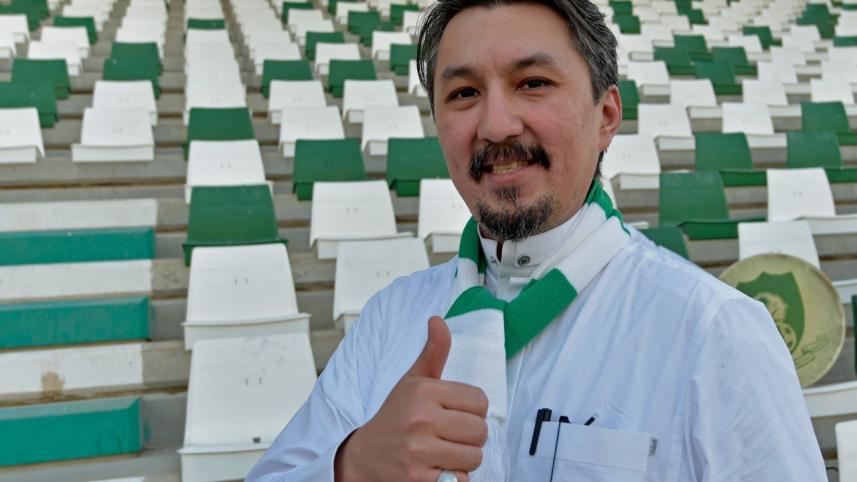 On a recent afternoon, wearing a white-and-green scarf over his traditional white thobe, Turkistani gave a preview of some of the chants he hopes will propel the Green Falcons to glory.