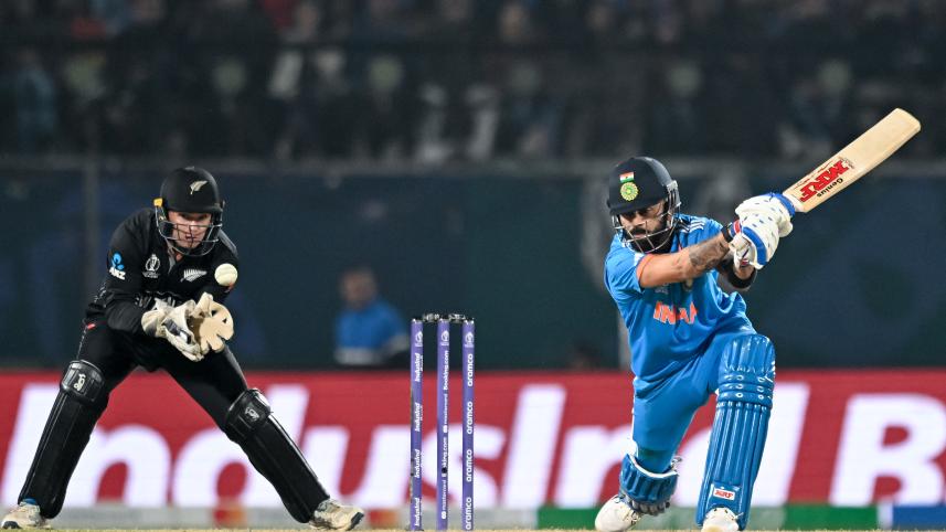 Virat Kohli hit 95 to lead India to a four-wicket victory over New Zealand and a fifth win in five matches at the World Cup on Sunday although the superstar batsman just missed equalling Sachin Tendulkar's record of 49 one-day international centuries.
