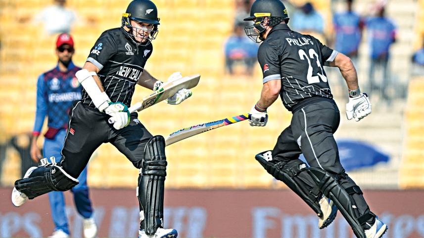 But Afghanistan hit back with three wickets off just nine balls for one run as pacer Azmatullah Omarzai dismissed Ravindra and Young in the same over.
