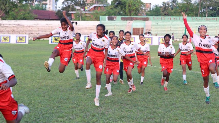 Rangpur district emerged champions of the JFA U-14 Women's Youth Development tournament by defeating Thakurgaon in a tiebreaker following a 1-1 draw in the final at Rajshahi Stadium on Thrusday.