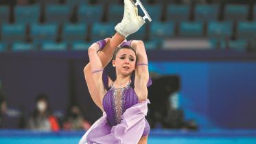Fifteen-year-old Kamila Valieva dominated on her Olympic debut Sunday in Beijing, coming close to breaking her own world record and propelling the Russians into first place ahead of the United States in the figure skating team event.