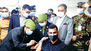 Bangladesh ODI skipper Tamim Iqbal and all-rounder Mehedi Hasan Miraz being administered the Covid-19 vaccine yesterday.