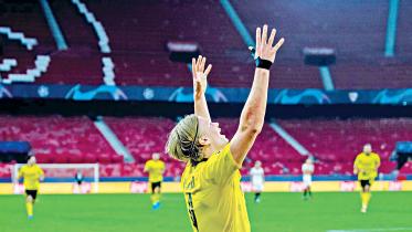 Borussia Dortmund’s Erling Haaland continued his prolific run in the Champions League by scoring twice as his side came from behind to earn a 3-2 win at Sevilla in a last-16 first leg on Wednesday.