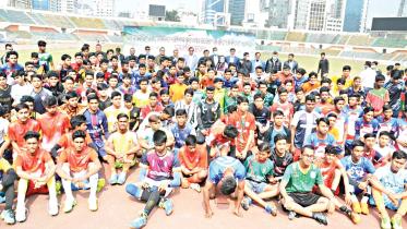 Bangladesh Football Federation officials pose for a photograph with budding footballers who turned up at the Bangabandhu National Stadium