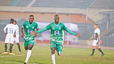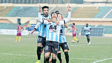 Mohammedan Sporting Club’s Malian forward Souleymane Diabate celebrates his 19th-minute opener against Arambagh KS in their Bangladesh Premier League fixture at the Bangabandhu National Stadium yesterday.