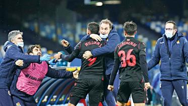 Real Sociedad striker Willan Jose embraces his jubilant coaching staff and teammates following his 90th-minute equaliser against Napoli in their Europa League