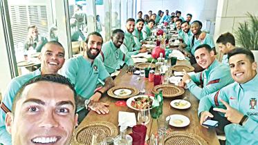 Cristiano Ronaldo posted this photo of a team meal with all members of the Portugal squad and wrote: “Unidos dentro e fora do campo! (United on and off the