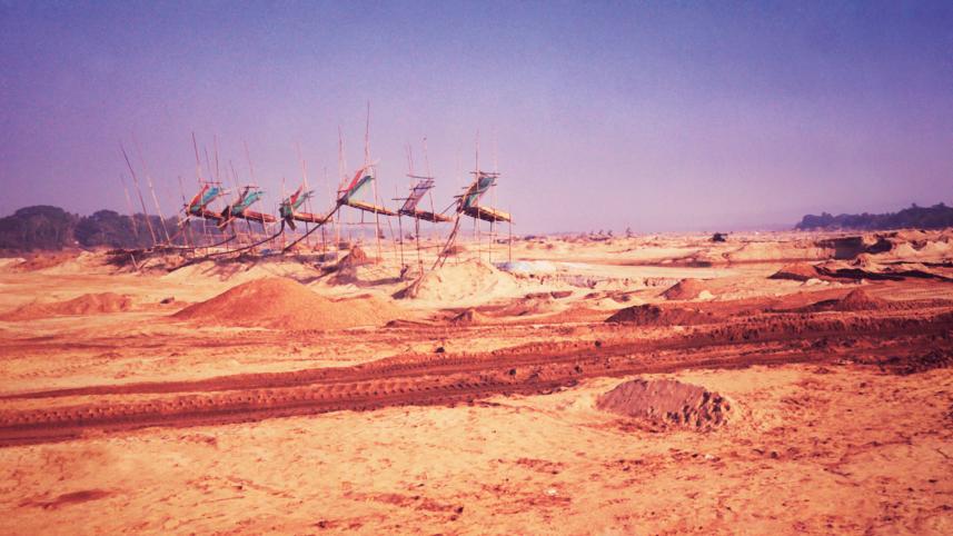 Next morning, I stepped out of my room before the sunrise. I could not see much into the distance because of the fog on the Someswari river's bank, but I did hear the sound of sand extraction. It was winter, and there was little water in the river. As I was stepping on the sand of the river, it reminded me of Tagore's poem "amader choto nodi chole banke banke," so I made up the following line: "Magh mashe tar mote jol nahi thake." After crossing the river, I rode on a motorcycle to the ceramic mountain. The biker was a young Hajong guy. Again, I could not see much of anything since the whole mountain region was wrapped in fog. As a result, I was also unable to capture the true magnificence of Someswari's crystal water or the blue lake beneath the ceramic mountain. However, I got real experience of how to extract sand. The majority of the people here rely on it for a living. Even in winter, the roads in Birishiri and Durgapur had turned sandy and muddy due to sand extraction and shipment by lorries.