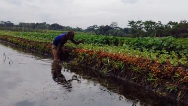 Farmers of the marshland in Nazirpur upazila of Pirojpur are busy in growing vegetable saplings on water bed, locally known as ‘Dhap’.