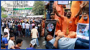 Teachers and students of Dhaka University blocked Shahbagh intersection in the capital earlier today, in protest of attacks on temples and mandaps across the country during Durga Puja.