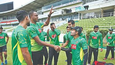Newly appointed bowling coach of Bangladesh, West Indies legend Courtney Walsh breaks the ice with cricketers at the practice session at Mirpur.