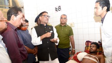 Road, Transport and Bridges Minister Obaidul Quader visits Hridoy, whose right hand was severed in a bus-truck collision last week in Gopalganj, at Dhaka Medical College Hospital.