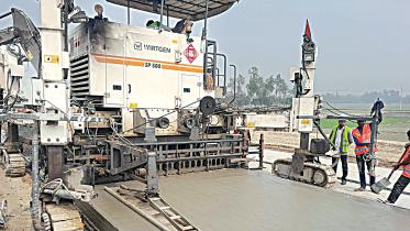 Ready-mix concrete is on a truck. An excavator carries and pours it onto the surface of an under-construction road. Then an automatic concrete-paving machine joins in and does the rest.