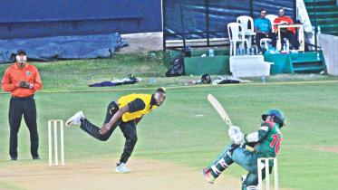 After two days and a session of mediocrity, the Bangladesh cricket team succumbed to an innings and 219-run defeat in the first Test against West Indies in Antigua yesterday. Rookie wicketkeeper-batsman Nurul Hasan scored 64 on the third morning, but it could not avert a capitulation of 144 all out shortly before lunch at the Sir Vivian Richards Stadium.