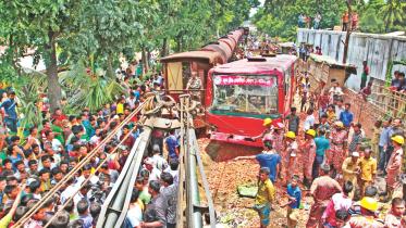 Two women were killed and at least five people injured as a train hit a BRTC bus on a railway crossing and dragged it around 150 yards along the track in the city's Sholoshohor area yesterday morning.