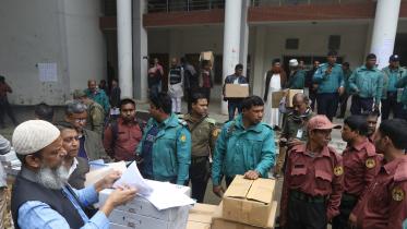 Returning officers of both Dhaka north and south city corporations have been distributing election materials including Electronic Voting Machines (EVMs) a day before the city elections are to be held tomorrow.
