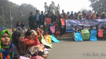 Students of Dhaka University (DU) blocks the roads adjacent to Raju Memorial sculpture on Dhaka University campus demanding that the university dissociate itself from the seven colleges which were affiliated last year.