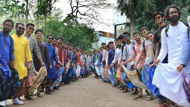 Male students of different departments of Dhaka University bring out a procession on the university campus wearing Bangladeshi traditional dress Lungi, demanding wider acceptance for it.